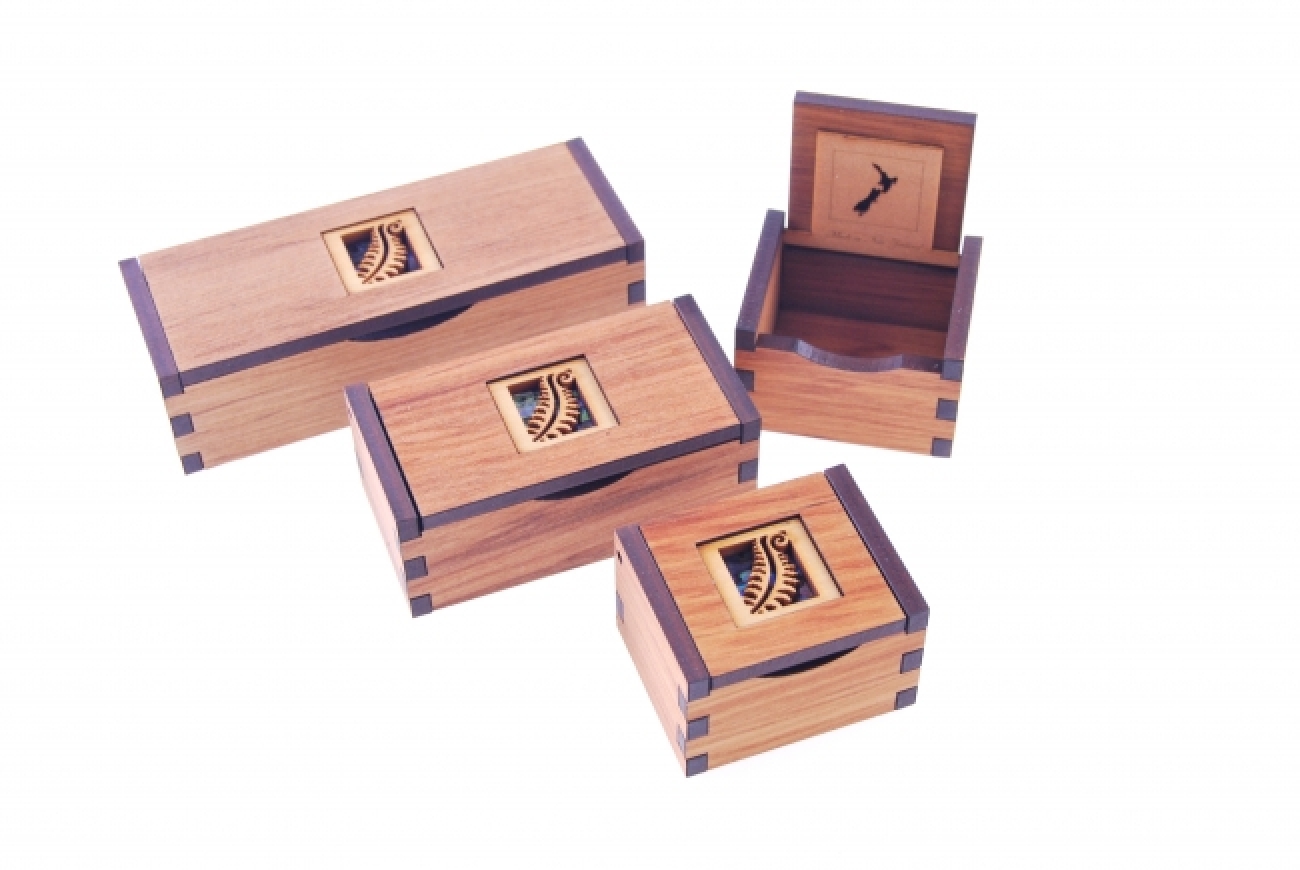 Rimu veneer boxes with hinged lid. Inner lid has Map of NZ with ‘Made in New Zealand’ engraved. Inlaid with Fern design & Paua Shell