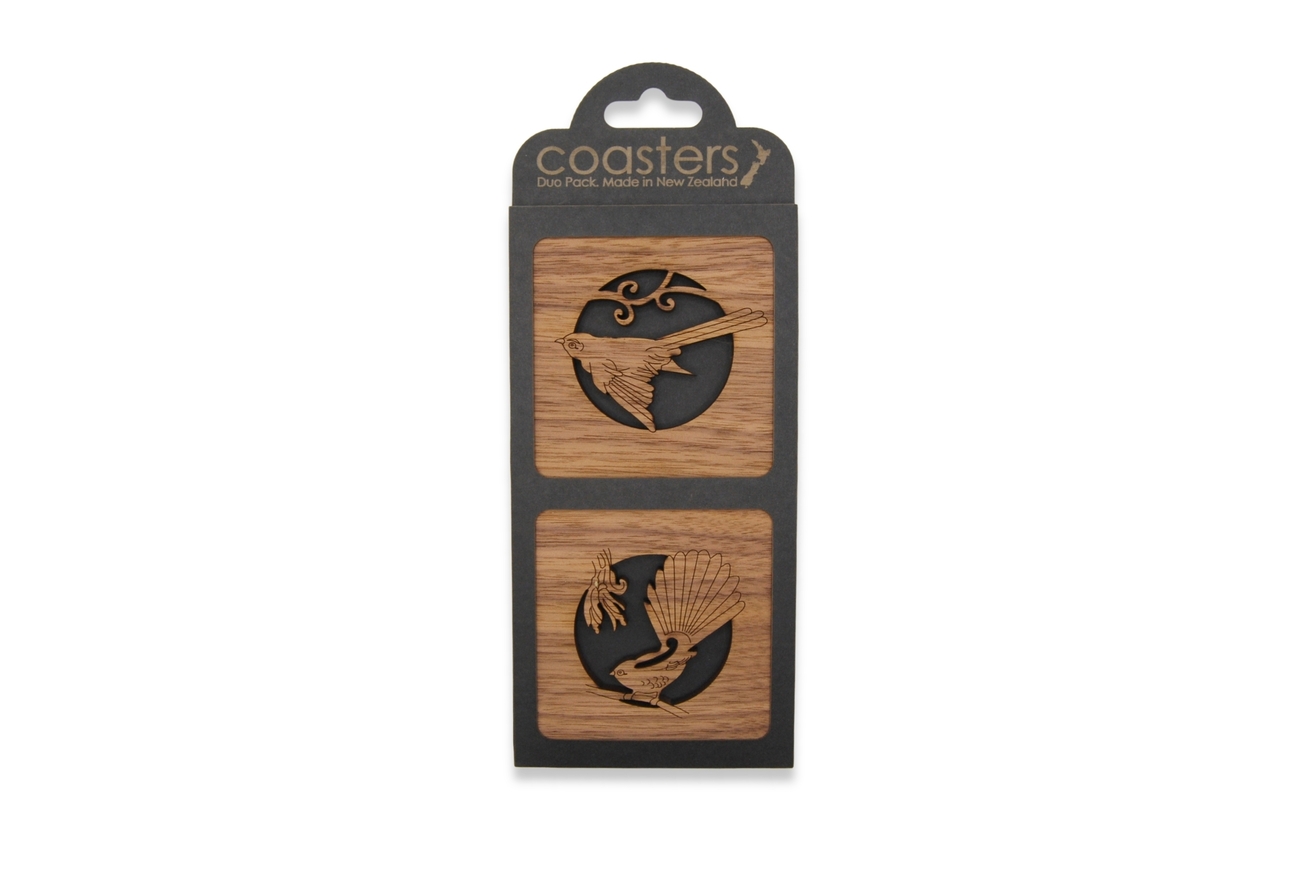 These differing but complimentary pair of coasters feature our New Zealand native Pīwakawaka (Fantail).