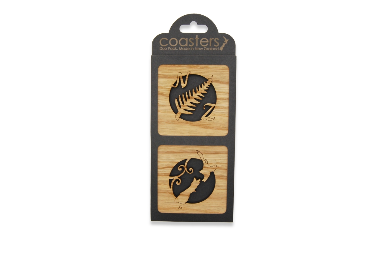 These differing but complimentary pair of coasters feature our native to New Zealand Silver Fern or Ponga and our map of home.