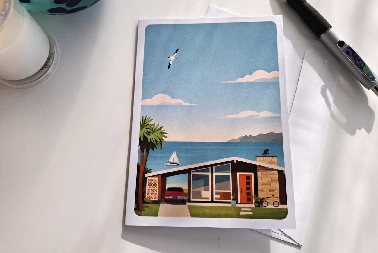 Designed and made in New Zealand, our mid-century inspired cards celebrate iconic Kiwi scenes with a nostalgic modern feel. Printed on quality stock and blank inside for easy, versatile gifting.